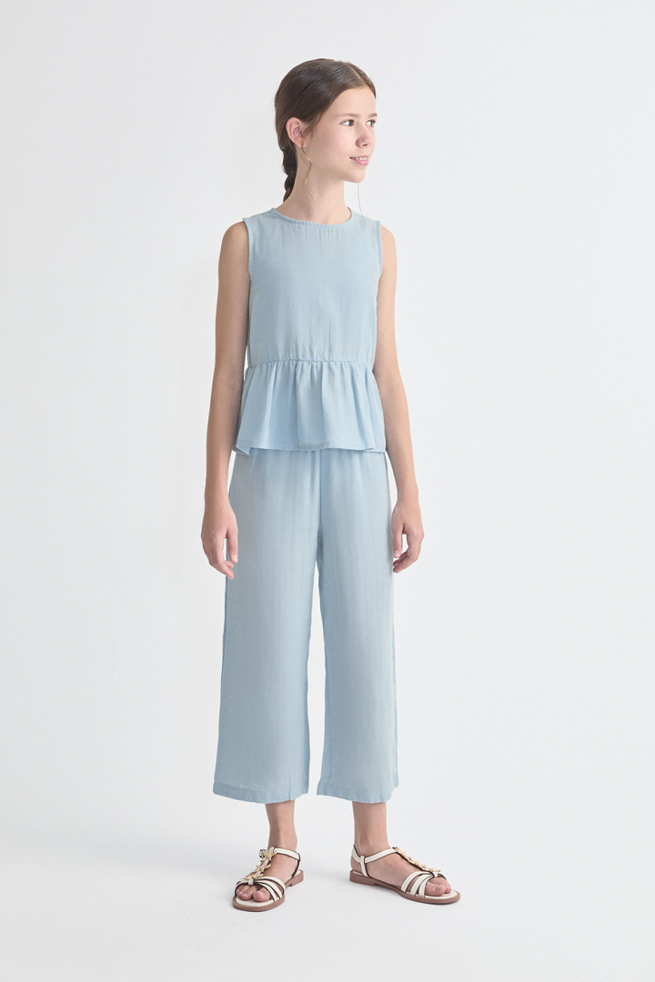 Blusa sin mangas para niña en color celeste. Diseño con volante en el bajo y cierre trasero, confeccionada en tejido ligero y fresco.