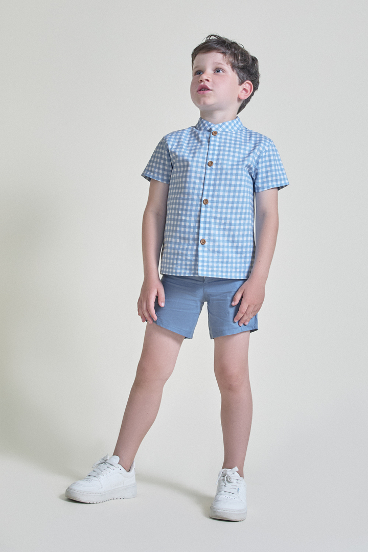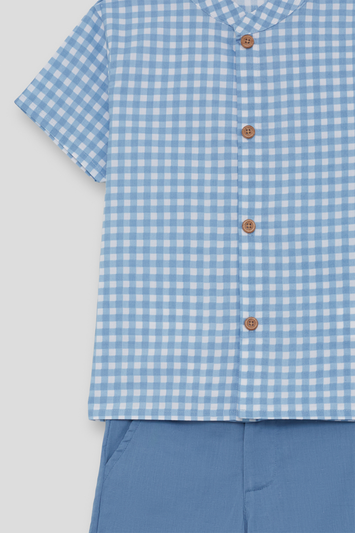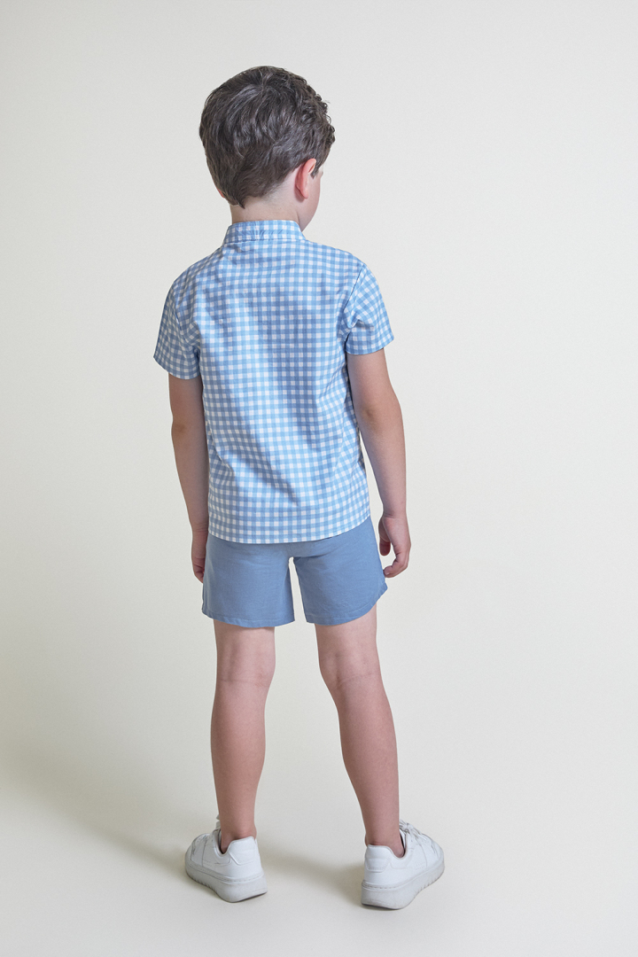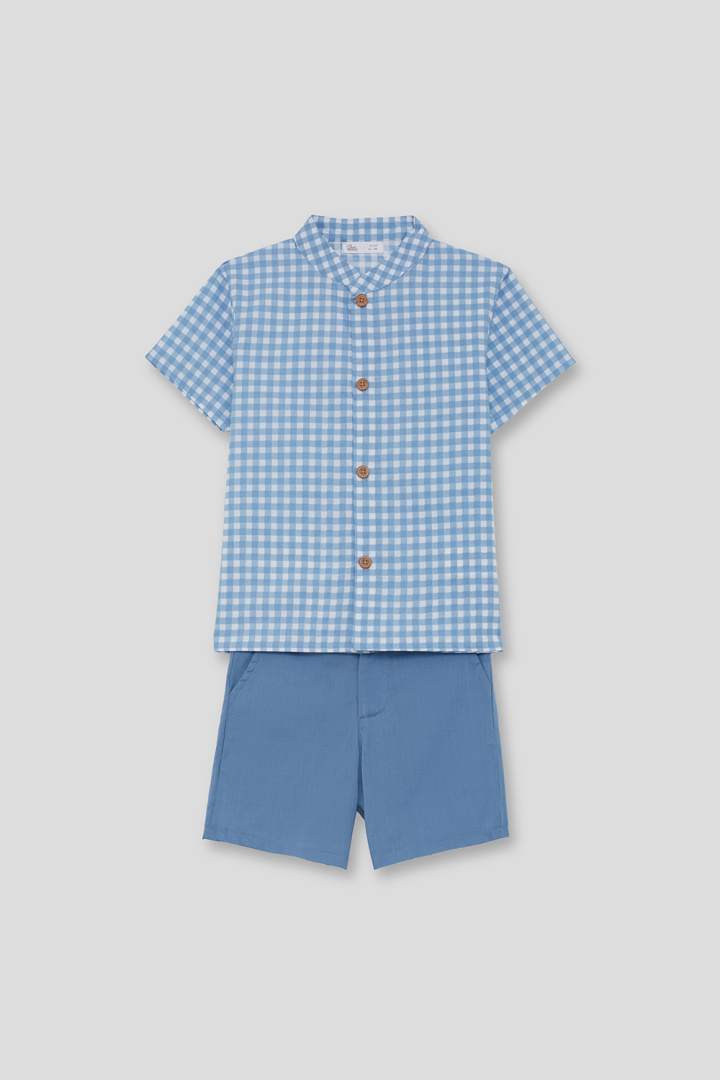 Conjunto de camisa y bermuda para niño de 2 a 16 años. Camisa de manga corta en estampado vichy azul medio con cierre de botones delanteros. Bermuda en azul liso con bolsillos laterales y cintura ajustable. Un conjunto fresco y cómodo, perfecto para el verano.