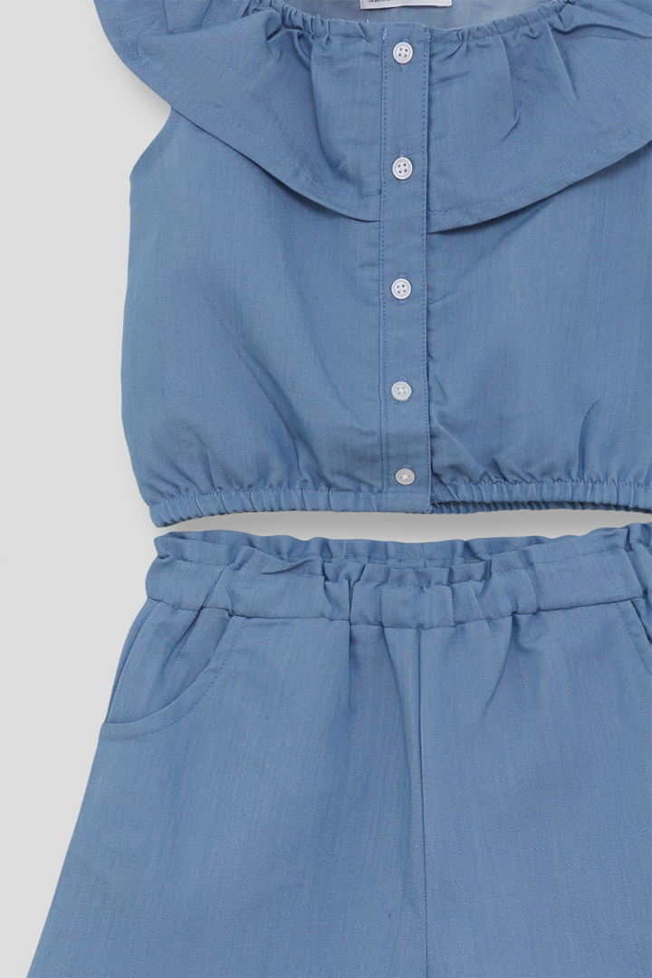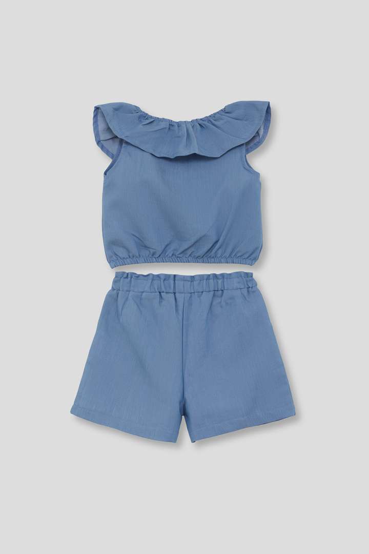 Conjunto corto sin mangas en color chambré. Diseño con volante en el cuello y cintura elástica para mayor comodidad. Ideal para días de verano.