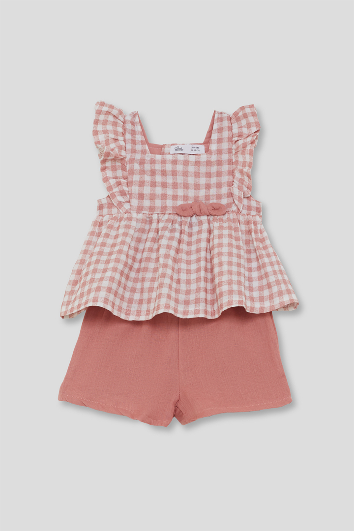 Conjunto para bebé niña. Blusa sin mangas en vichy maquillaje con volantes y lazo decorativo en la cintura. Shorts lisos a juego en color maquillaje, con cinturilla elástica para mayor comodidad. Ideal para looks frescos y veraniegos.