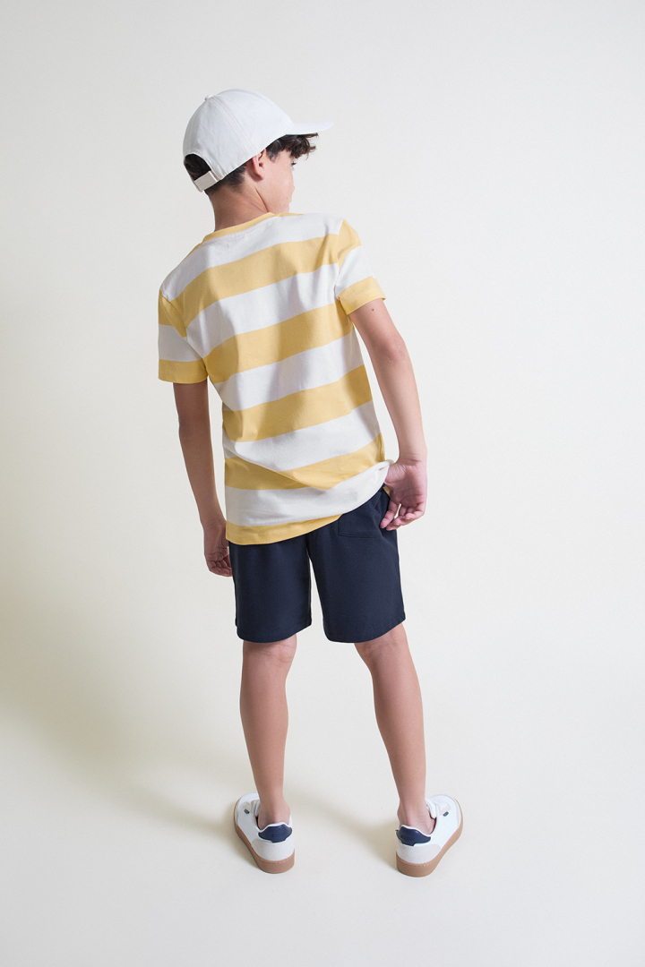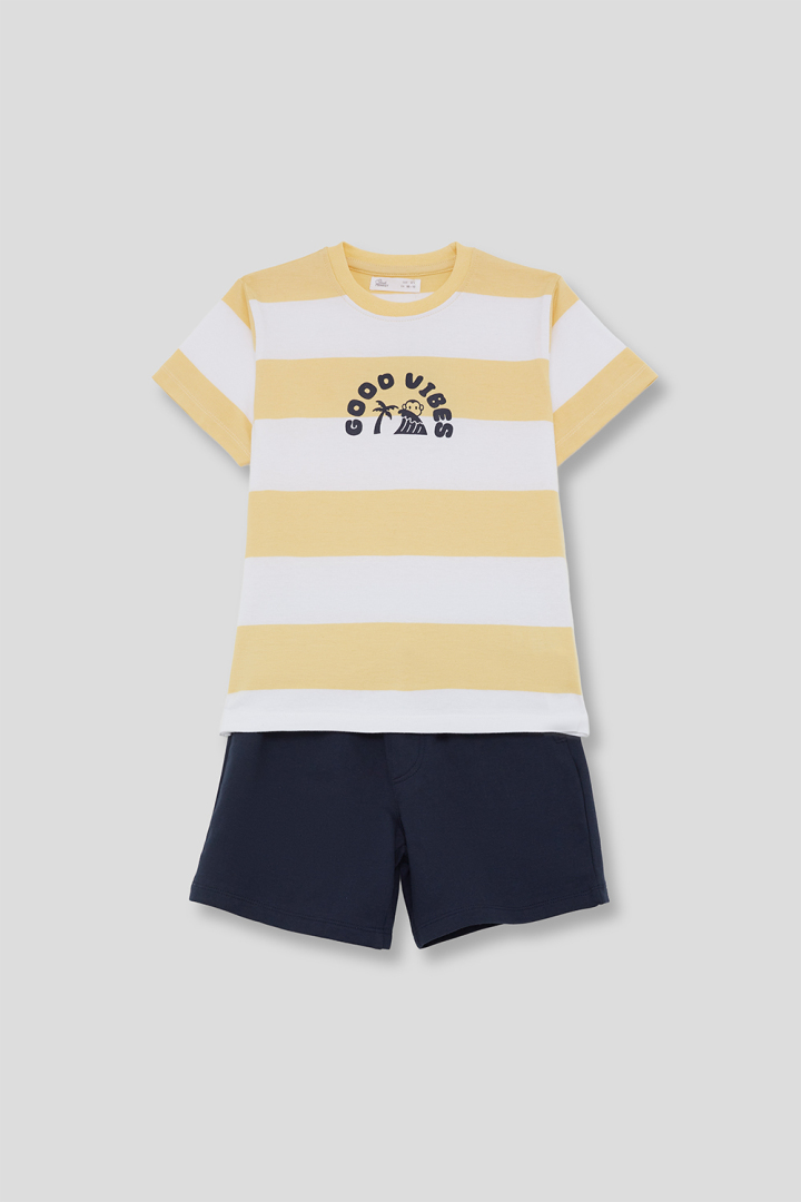 Conjunto de dos piezas, camiseta y shorts para niño. Camiseta de manga corta a rayas en color blanco y amarillo, con estampado frontal “Good Vibes” en contraste. Shorts en color azul marino con cintura elástica para mayor comodidad. Tejido ligero y fresco, ideal para los días de verano.