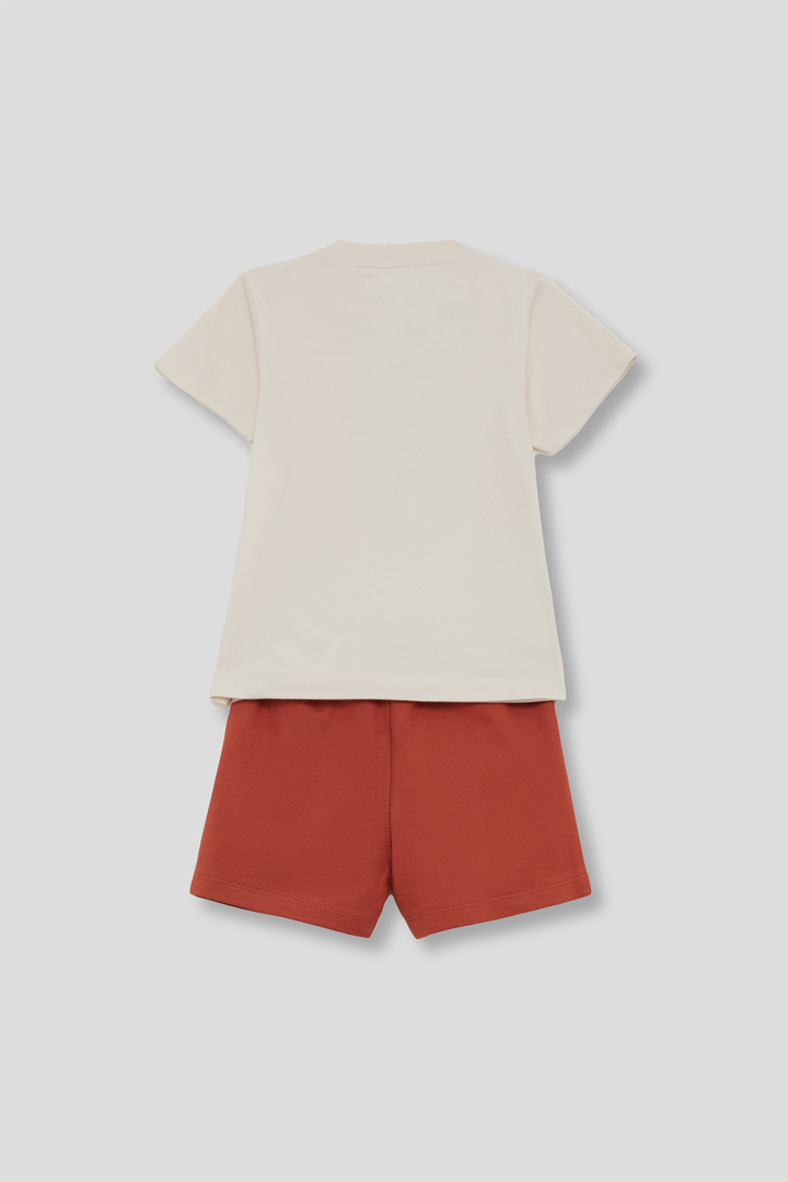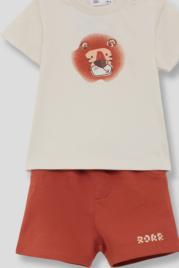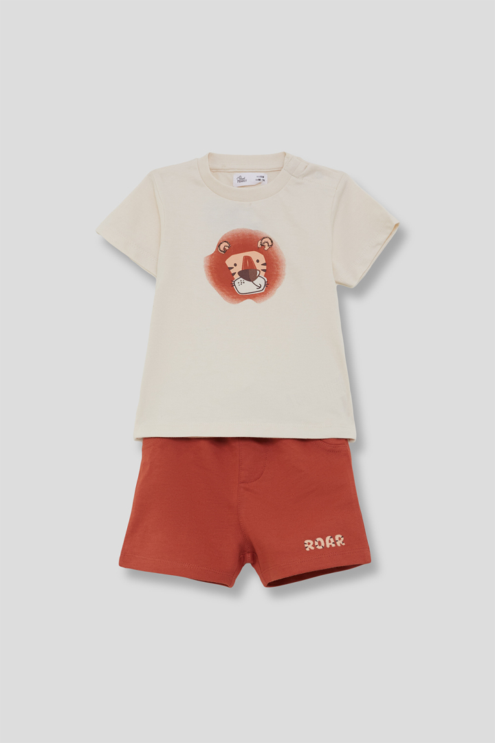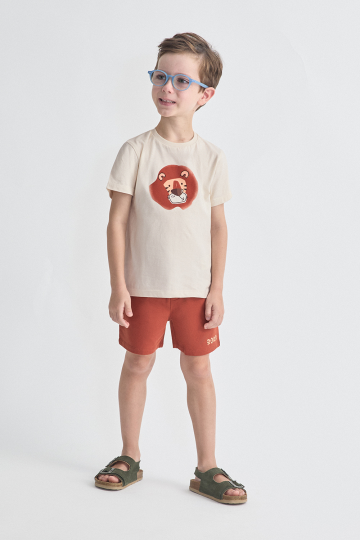 Conjunto de dos piezas para niño. Camiseta en color crudo con estampado de león en el frontal. Shorts en color teja con detalle bordado “ROAR” en el bajo. Confeccionado en algodón suave, ideal para la comodidad diaria.