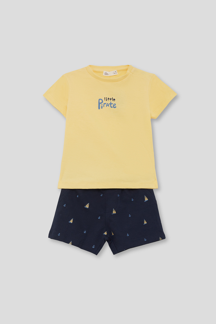 Conjunto de dos piezas, camiseta y shorts para niños. Camiseta amarilla de manga corta con estampado frontal “Little Pirate”. Shorts en azul marino con estampado de veleros y anclas, cintura elástica y bolsillos.