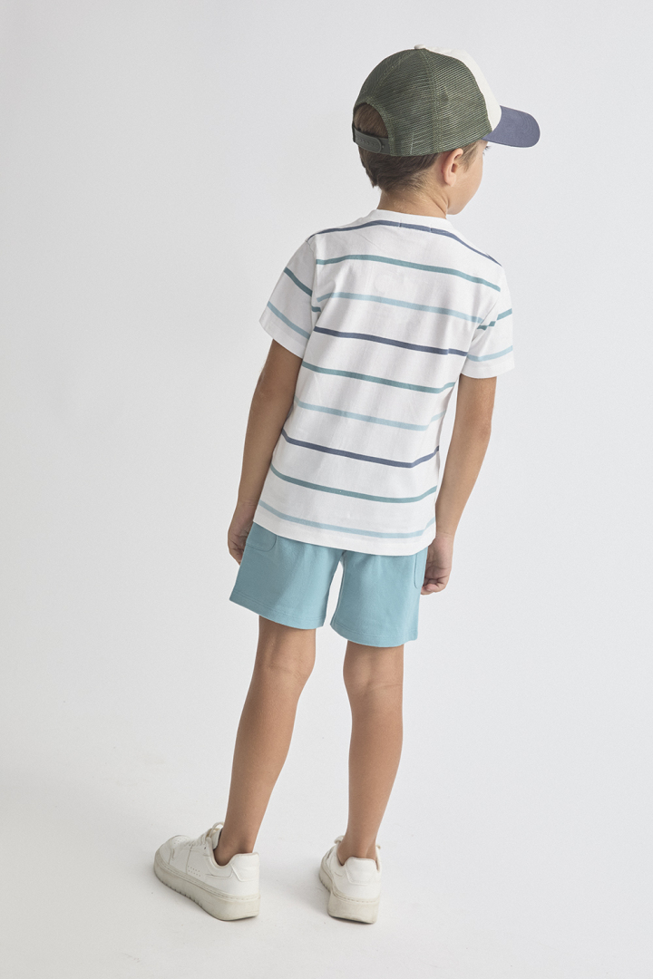 Conjunto de dos piezas de niños. Camiseta de manga corta en color blanco con estampado de rayas en tonos azules y detalle bordado “Skater”. Pantalón corto en color azul con bolsillos delanteros.