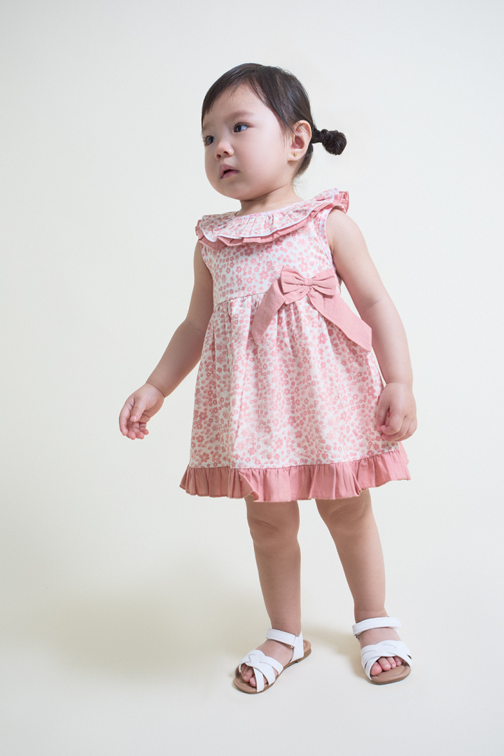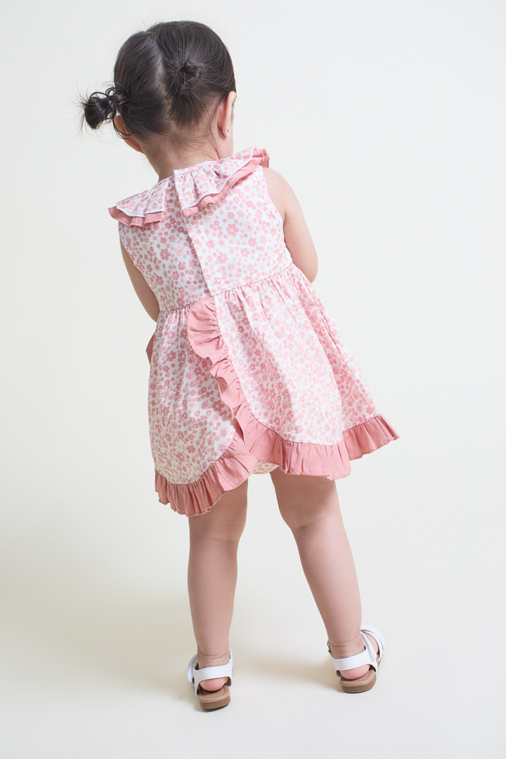 Conjunto de dos piezas para recién nacido niña de 1 a 24 meses. Vestido sin mangas en estampado floral color maquillaje sobre fondo crudo. Presenta cuello volante a juego y detalle de lazo decorativo en la cintura. El bajo está acabado con franja en color maquillaje que aporta un contraste delicado. La parte trasera incluye cierre con botones a presión para facilitar la puesta. Braguita a juego en el mismo estampado, con cintura y bajos elásticos que aseguran un ajuste cómodo. Confeccionado en tejido fresco y transpirable, ideal para el verano, aportando comodidad y dulzura en cada detalle.