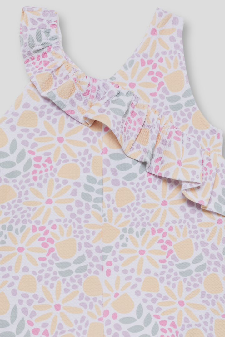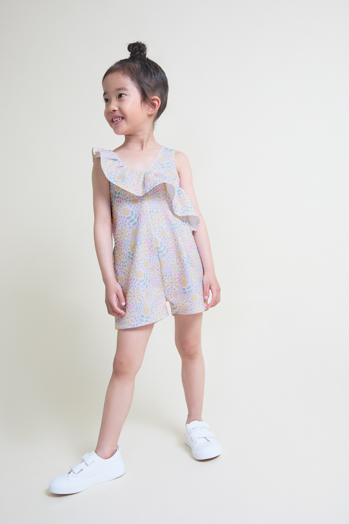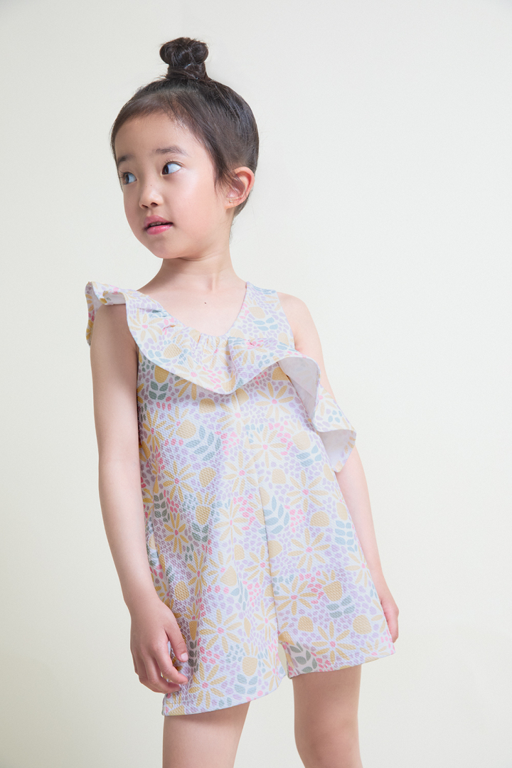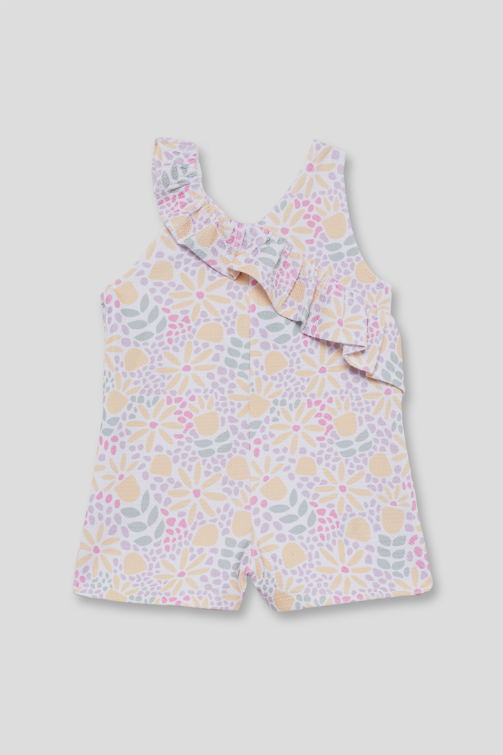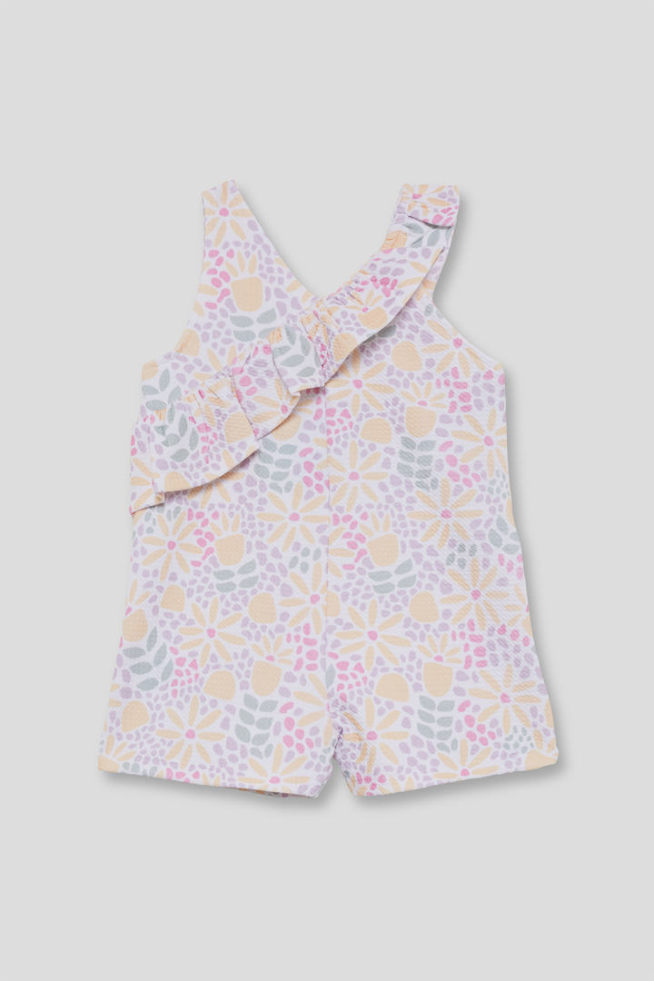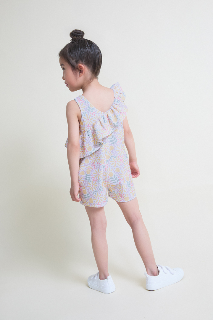Mono corto para bebé niña de 3 años a 6 años. Diseño estampado multicolor con flores y piñas, tirante ancho y detalle de volante diagonal en el pecho. Tejido ligero y cómodo para los días de verano.