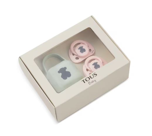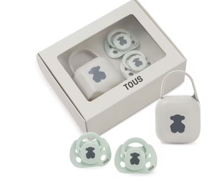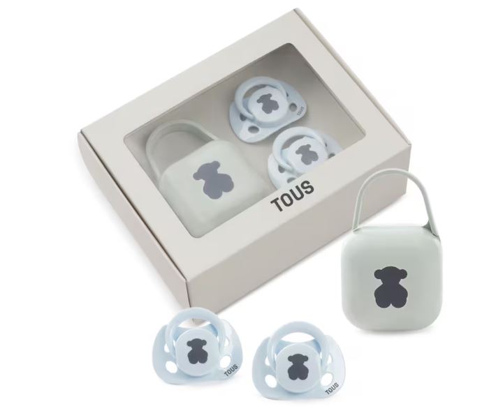 Pack 2 chupetes y portachupetes TOUS Baby anatómicos para bebés de 0-6 meses. Chupetes con tetina anatómica de silicona. Es la tetina mas recomendada ya que consigue que la lengua se mantenga en la misma posición natural que cuando el bebé mama. Permite más espacio a la lengua en la cavidad bucal, dejando que se resarrolle el maxilar y la mandibula. Portachupetes con capacidad para guardar hasta 2 chupetes con asa flexible para poder colgar en cualquier lugar (6 cm ancho x 7 cm fondo x 11 cm alto). Chupete anatómico de silicona 0-6 meses (2 unidades). Cunple con la normativa 1400 + A2: 2019. Silicona especial para uso alimentario. Color rosa, verde o azul.