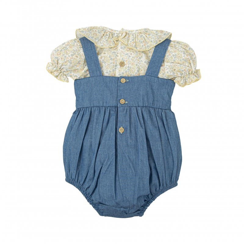 Conjunto de bebé compuesto por blusa con delicado estampado floral y cubrepañal tipo peto en tejido denim. Un diseño dulce y elegante que combina el encanto clásico con un toque moderno, ideal para ocasiones especiales o para el día a día.