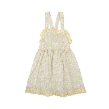 La blusa presenta cuello volante y mangas cortas fruncidas, aportando un estilo romántico y delicado. El cubrepañal en tono denim incorpora tirantes con botones de madera y un bonito bordado floral en el pecho, que añade un detalle artesanal y encantador. El diseño fruncido del cubrepañal garantiza comodidad y libertad de movimiento para el bebé.