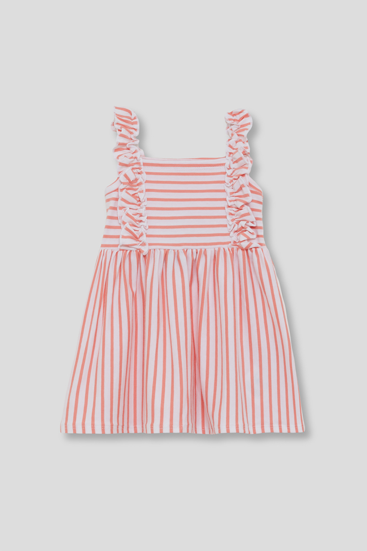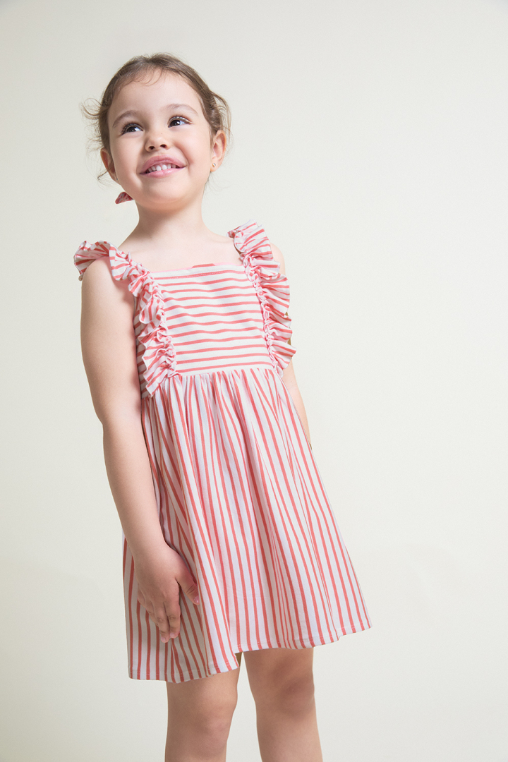 Vestido para bebé niña. Vestido sin mangas en color coral con estampado de rayas horizontales y verticales, decorado con volantes en tirantes delanteros. Confeccionado en tejido fresco y ligero, ideal para el verano.